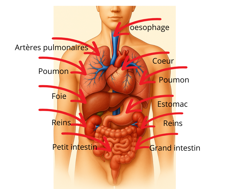Une illustration synthétique du corps humain mettant en évidence les reins, les poumons et les artères principales : un rappel visuel de l’interconnexion des organes.